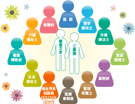 医師・看護師をはじめ、理学療法士、作業療法士、言語聴覚士、ナースエイド(介護福祉士・看護補助者)、薬剤師、管理栄養士、医療ソーシャルワーカーなど、さまざまな専門職が連携し、患者さん一人ひとりに合わせたプログラムを作成。そのプログラムに基づき、リハビリテーションを中心とした治療を進めていきます。