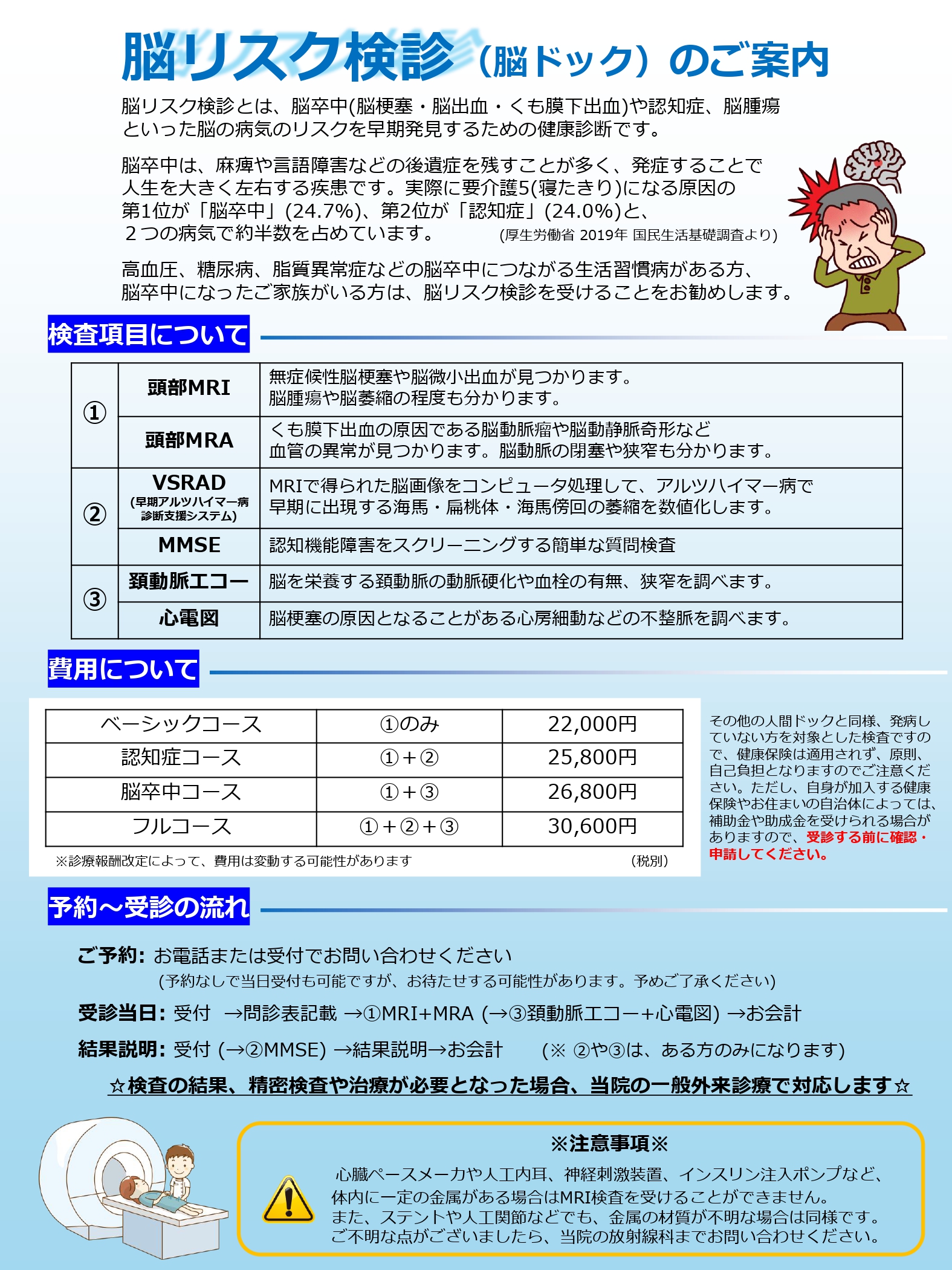 脳リスク検診とは、脳卒中(脳梗塞・脳出血・くも膜下出血)や認知症、脳腫瘍といった脳の病気のリスクを早期発見するための健康診断です。