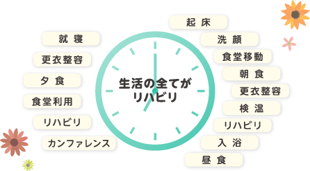 ベッドからの起き上がりや移乗、食事、整容、更衣、移動、入浴、トイレ、階段昇降、屋外歩行など、病棟での生活そのものがリハビリの場となります。